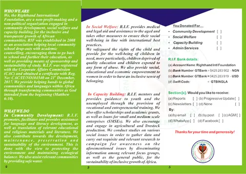 In Community Development: R.I.F. promotes, facilitates and provides assistance for language and literacy development, as well as translation of relevant educational and religious materials and literature. We also contribute towards the development, maintenance, preservation and sustainability of the environment. This is done with the view to protecting the environment and maintaining ecological balance. We also assist relevant communities by providing safe water.