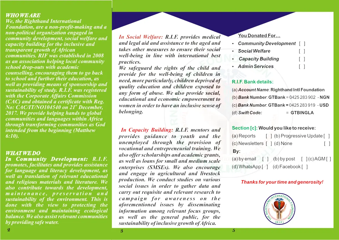 We, the Righthand International Foundation, are a non-profit-making and a non-political organization engaged in community development, social welfare and capacity building for the inclusive and transparent growth of African communities. RIF was established in 2008 as an association helping local community school drop-outs with academic counselling, encouraging them to go back to school and further their education, as well as providing means of sponsorship and sustainability of study. R.I.F. was registered with the Corporate Affairs Commission (CAC) and obtained a certificate with Reg. No: CAC/IT/NO104540 on 21st December, 2017. We provide helping hands to global communities and languages within Africa through transforming communities as God intended from the beginning (Matthew 6:10).